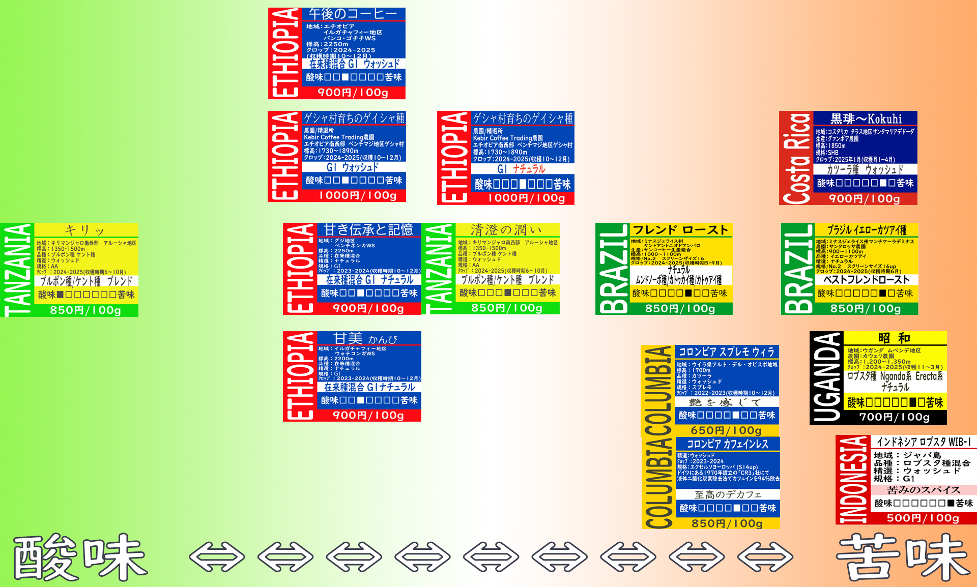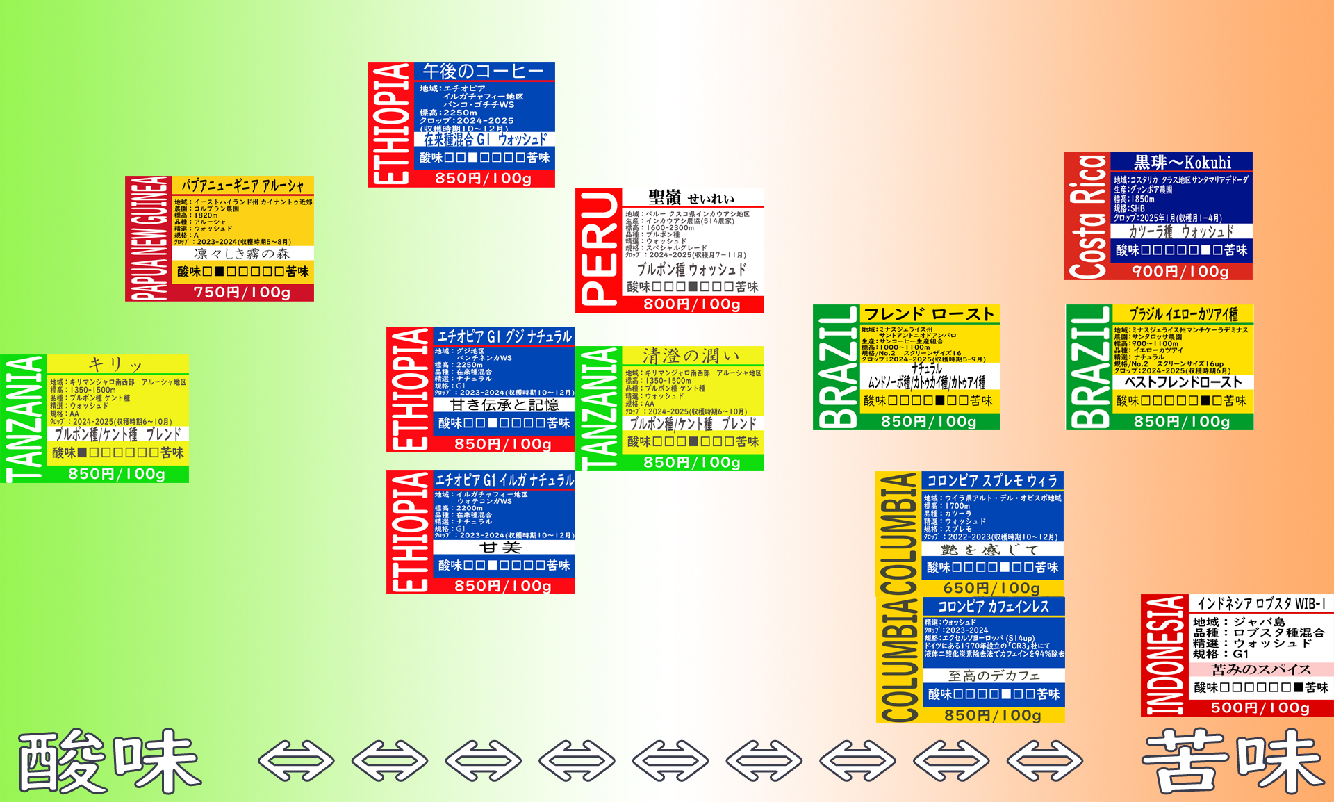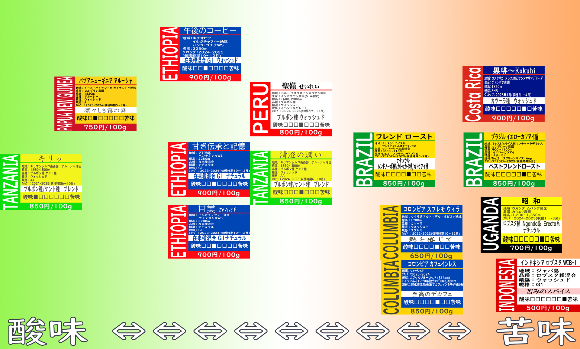 [インドネシア]コピ・ルアク, [グアテマラ]SHB アゾテア農園, [デカフェ]エチオピア モカG4, [デカフェ]コロンビア スプレモ EX, [ケニア]AA キアンジョグ農園, [エチオピア]モカ イルガチャフィナチュラルG1, [エチオピア]モカ イルガチャフィウォッシュドG1, [ボリビア]ロスロドリゲース農園, [インドネシア]ロブスタ WIB-1, [ルワンダ]ブルボンウォッシュド, [ルワンダ]ブルボンナチュラル, [パプアニューギニア]ティピカ, [ウガンダ]ナチュラルロブスタ